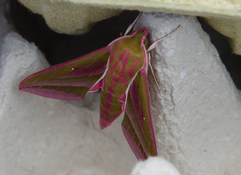 A most stunning Elephant Hawk Moth. That colour combination of hot pink and sharp lime seems far too bright for these UK shores, but it is a native and fairly common. Apparently it is so called because its caterpillar looks like an elephant's trunk. It's one of the moths that I've spent my life looking at other people's pictures of, but never expected to find one in my tiny town garden. Delighted to be proved wrong....indeed I was so delighted that I got David out of bed to come and see it. I hasten to add that he didn't mind as it's such a stunner. It was delivered to a place of safety where it could snooze out of harm's way until it resumes its nocturnal adventures tonight. Absolutely cock-a-hoop about this one.